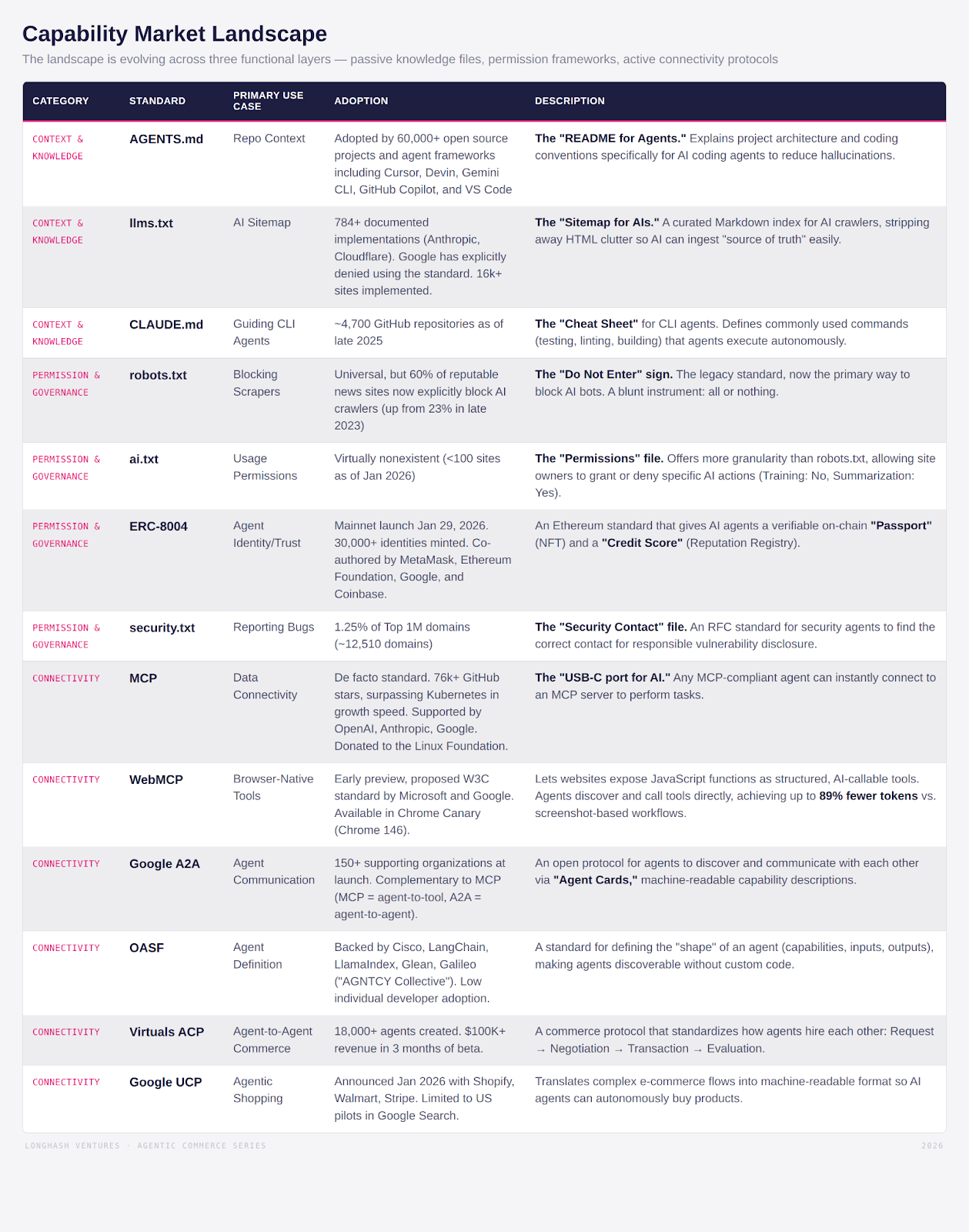 The agentic commerce stack is crystallizing with clear protocol winners in some layers (MCP for context, x402 for payments). But discovery, identity, and reputation remain deeply fragmented, representing the largest infrastructure gap and the most compelling investment opportunity.