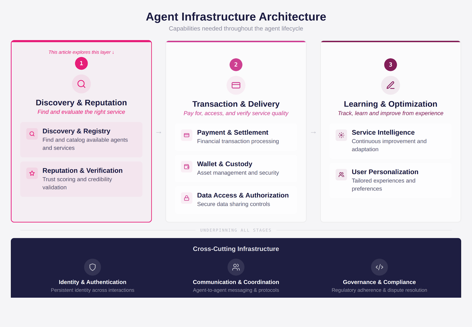 This article explores those critical missing layers: how agents find services and other agents (Discoverability) and why agents trust other agents and services (Reputation). These are the prerequisites that make everything else (payments, commerce, autonomy) actually work.